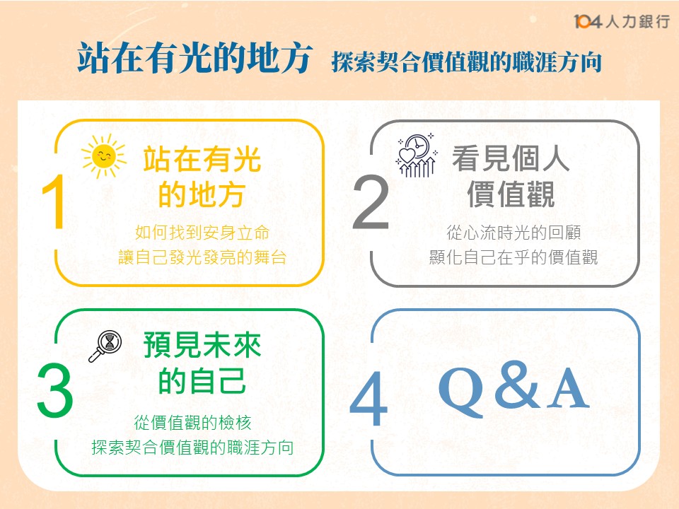 我們邀請 104 人力銀行副總經理 Spring 老師(政大心理學博士),帶領你進行一場「價值觀外顯化」的探索。透過約60分鐘的引導與盤點,將冰山下看不見的內在驅動力具象化,協助你建立屬於自己的價值優先順序。