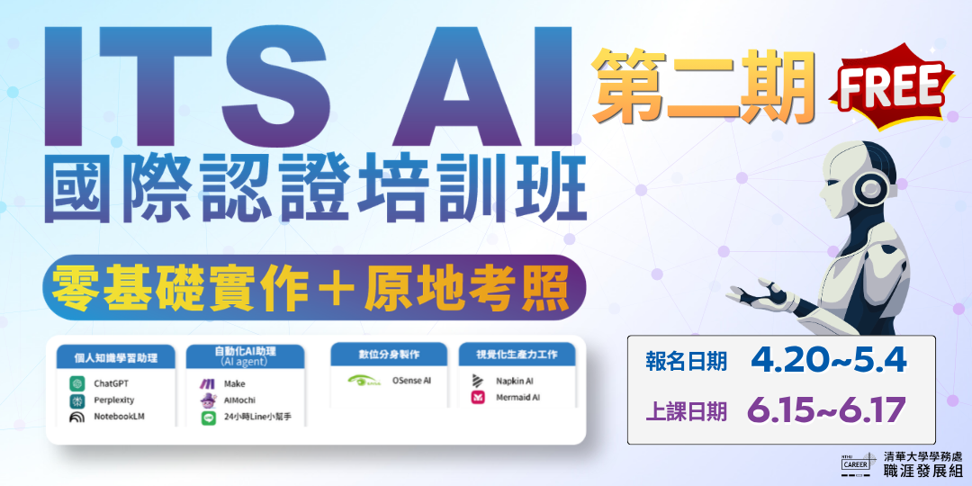 清華大學職涯發展組為了提升學生在職場上的競爭力,特別規劃了職涯數位能力課程,旨在幫助學生培養未來的就業技能。隨著 AI 人工智慧成為最熱門的新興科技,其核心能力在職場上越來越受到重視。本課程設計完全對應 ITS AI 的考科範圍,深入分析並安排所有流程,透過密集訓練與系統化學習,即使是初學者也能在短時間內掌握關鍵知識,順利通過認證考試。即便是無基礎的學生從零開始也可培養應用能力,幫助學生與產業接軌。課程中將包含廣泛應用 AI 工具的實做練習,指導學生在學習技能後產出符合企業需求的作品,進一步提升其專業能力和面試競爭力。